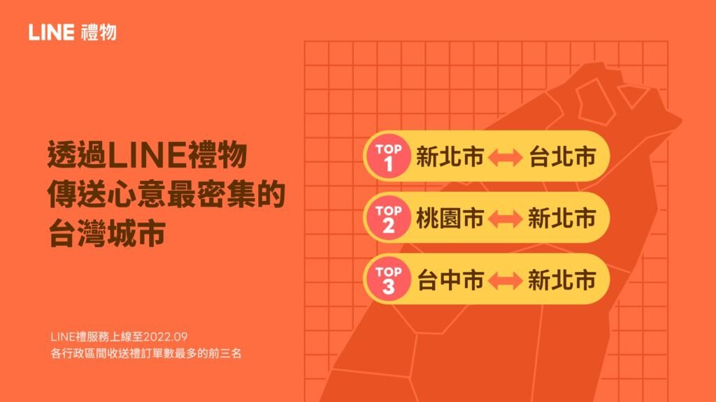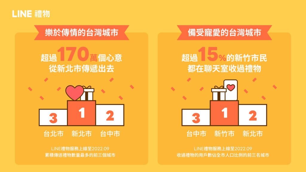 在台灣各城市中,最樂於透過 LINE 禮物表達心意的前三名分別是新北市、台中市和台北市,其中,新北市至今已送出超過170萬個心意禮物;而新竹市、新北市和台中市的市民則備受寵愛,接收到最多來自親友的祝福禮物,其中,有超過15% 新竹市民曾於 LINE 聊天室收過「一則裝著禮物的私訊」!禮尚往來藉由回禮表達感謝也很常見,在台灣所有城市中,新北市、台北市、桃園市、台中市相互收、送禮訂單數加總最多,顯示這幾個城市市民彼此之間擁有最緊密的情感連結。