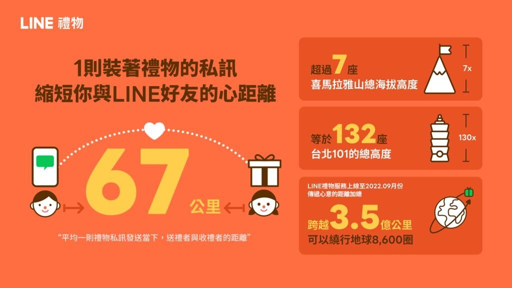 依循LINE台灣電商事業「Social Commerce」策略,LINE禮物於去(2021)年中轉型為線上社交送禮平台,鼓勵用戶透過聊天室即時傳遞心意,創造真實的情感互動,拉近彼此距離。根據LINE禮物內部統計,服務上線一年多來,「聊天室出發的心意禮」平均跨越了67公里。為了讓禮物能更精準地投其所好,LINE禮物也持續優化送禮功能,像是「我的願望清單」功能,讓用戶一鍵收藏屬意的禮物;數據指出,用戶每收藏五個禮物其中就有一個願望會被實現。