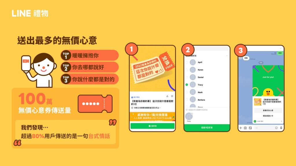 越來越多用戶習慣使用 LINE 禮物在重要節日推出的期間限定「無價心意券」傳達祝福,累計已送出超過 100 萬張,而最受用戶喜愛的台式情話前三名依序是「暖暖擁抱你」、「你想去哪都好」及「你說什麼都是對」,充分表現台灣用戶滿腔熱火卻帶靦腆的真性情。用戶收到禮物後發出給送禮者的「感謝小卡」,簡單精緻設計出有趣內容表達收禮感謝,讓超過三成送禮者備感溫暖!