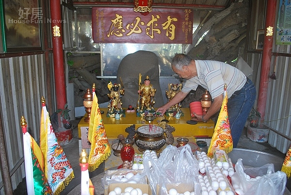 外埔區大甲溪畔重逾千斤的河神石,區民有感防水防災保護農作物,神桌上經常排滿供品,感謝河神石神威顯赫。(記者陳榮昌攝)