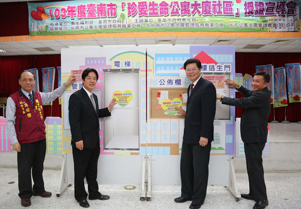 台南市衛生局4月1日下午舉辦『珍愛生命公寓大廈社區』授證宣導會,會中由賴清德市長親自授證予加入「珍愛生命公寓大廈社區」的代表並頒獎感謝狀予這群珍愛生命的公益大使,感謝他們共同為臺南市的自殺防治盡一份心力。
