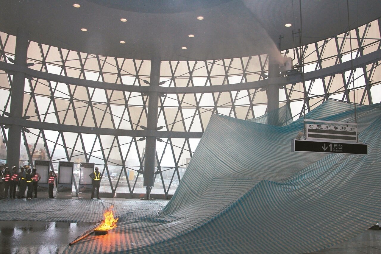 南站挑高大廳安裝2具國內目前僅台北市小巨蛋採用,數一數二的高科技主動式自動灑水設備「大水槍」,在實測時,安檢人員在大廳點著火煙,面對火源的一支大水槍,火煙偵測器確認火源,立即自動朝火源方向噴灑大面積的水花滅火,功能正常,消防局副局長陳龍輝說,檢查結果今天會公布。