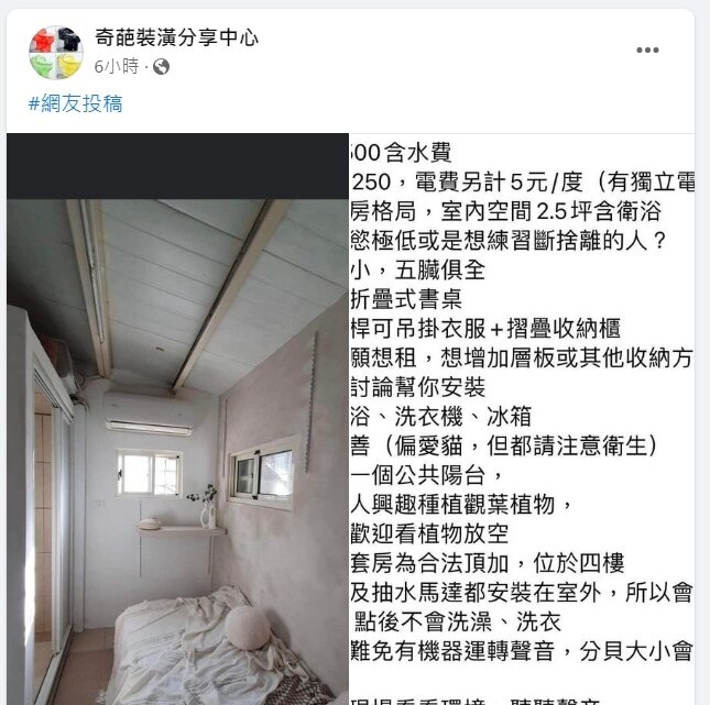 根據租屋平台顯示,這棟4層樓公寓套房距離捷運永春站僅10分鐘,招租的是2坪的頂樓戶,電費和瓦斯費額外計算,附帶壁掛折疊式書桌以及折疊收納櫃等,還強調「想增加層板或其他收納方式都可以討論幫你安裝」,並且主張「適合物慾極低或是想練習段捨離的人」,似乎透露出對小空間的諸多限制。物件引發網友熱議,部分觀點認為租金太高「3000還差不多」、「我家透天才一萬欸!」,但更多人對裝潢感到詫異,直言伸手就碰到牆壁連翻身都困難「根本是住在監獄吧!」