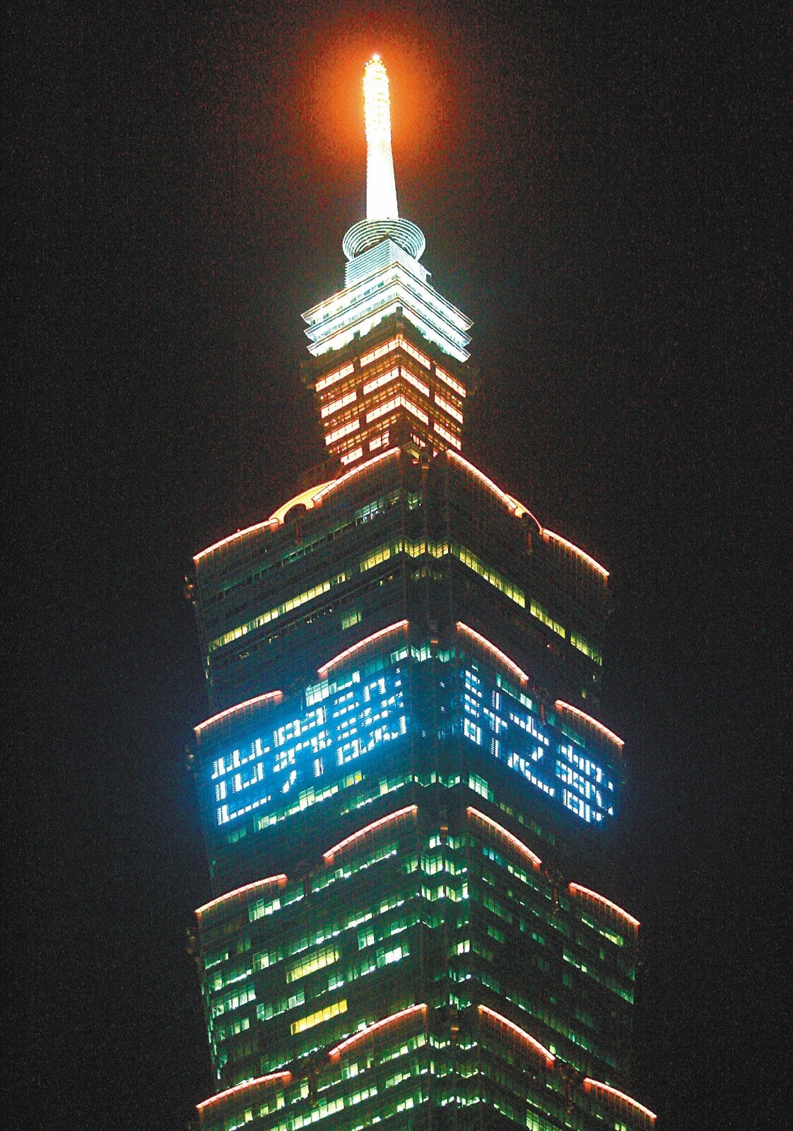 台北市獲選2016世界設計之都,101昨晚亮起中、英文「台北世界設計之都」的字樣慶祝。(記者趙文彬/攝影)