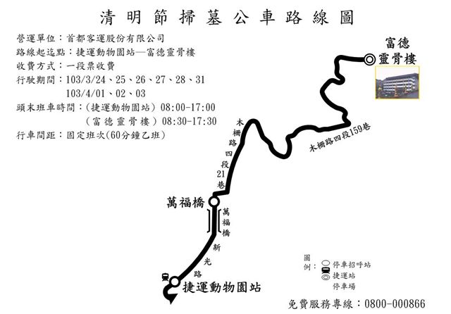 另為提供平日掃墓民眾接駁服務,今年3月24日至28日、3月31日至4月3日特別闢駛捷運動物園站至富德靈骨樓之接駁公車,營運時間為上午8時至17時,每小時於捷運動物園站準點發車,採一段票收費,平日上山掃墓民眾可多加利用。
