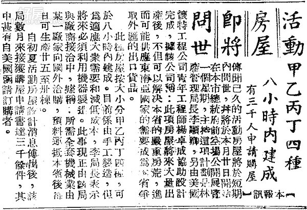 舉例來說,1951年是國民黨遷台第2年,為了解決大量移居民眾居住問題,加上當時政府僅將台灣作為「暫時棲息地」,因此推出8小時內可建成的「活動房屋」。