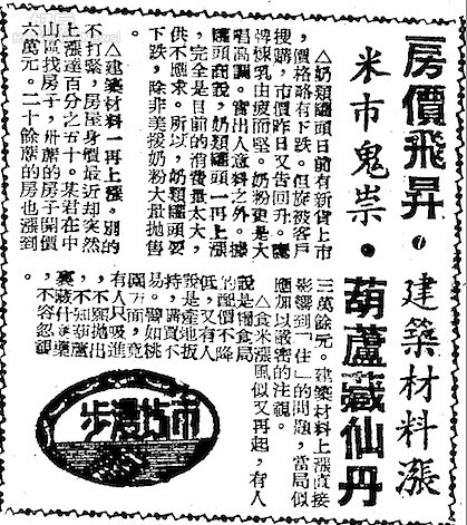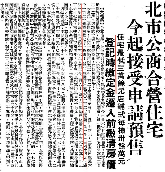 1953年物價飆漲,也出現「房市飛昇」的訊息,但當時房價上揚的原因較為單純,主要是整體物價上漲、建材上漲,下文可發現當時中山區房屋每戶開價6萬元。
