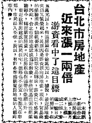 1955年則出現「股票交易轉淡,游資轉入股市」的訊息,讓房價漲了1~2倍。