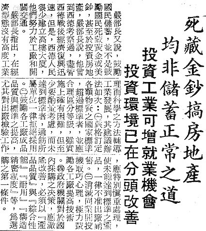 言下之意代表,民眾應該積極朝可創造就業機會的投資,而非買房賺增值財,與今日大家拼命買房、存房,期待靠房產致富的觀念大相徑庭。