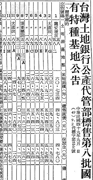 1950年代報章鮮少出現房地產廣告,有關房屋、土地的廣告,大多是銀行代管的土地進行標售訊息,例如以下就是1960年土地銀行公告標售大直、松山、大安區土地的廣告。當時大安區龍安坡段土地換算1坪787元。