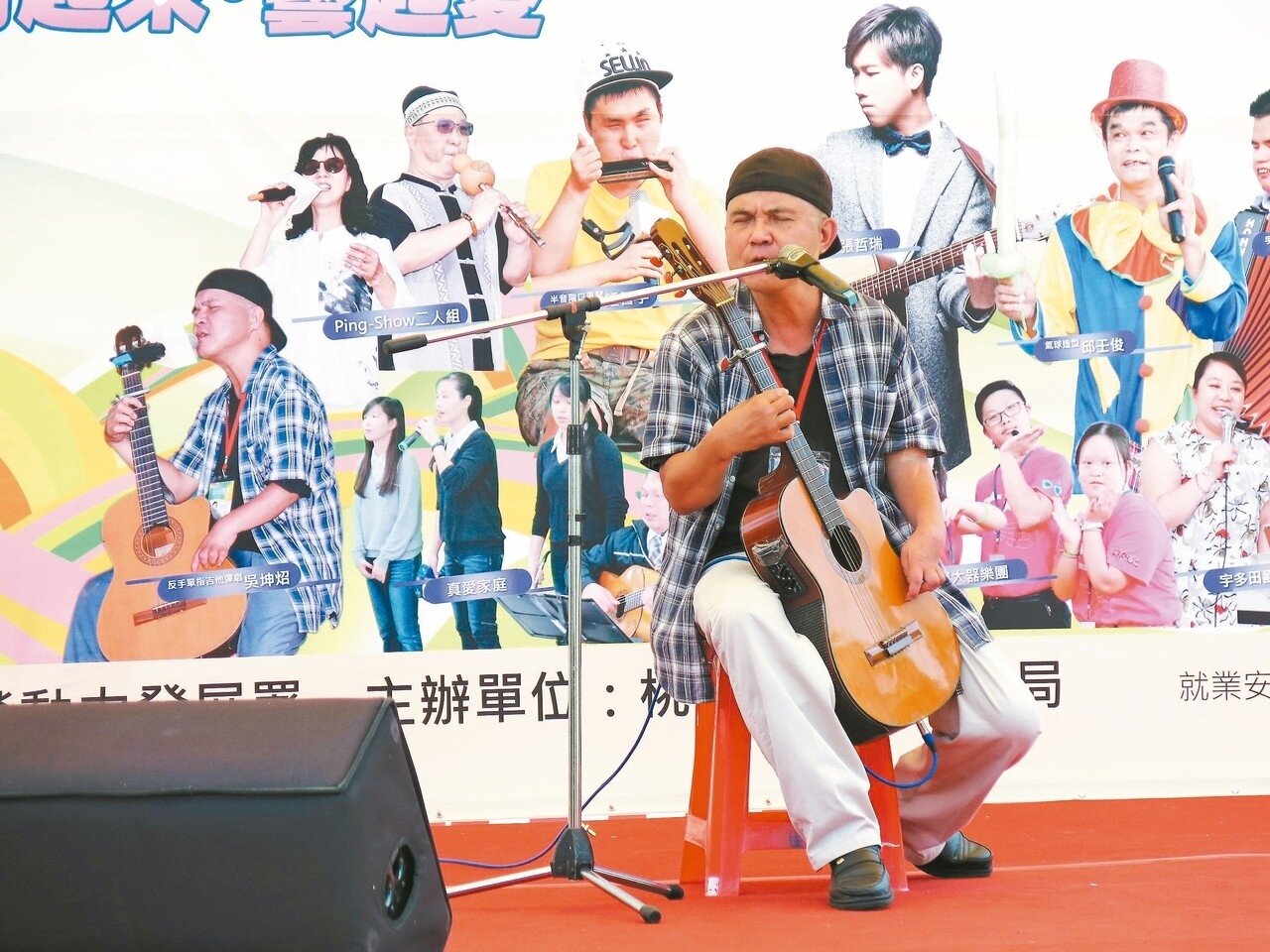 桃園市身障街頭藝人嘉年華昨在風禾公園舉行,街頭藝人吳坤炤反手單指彈吉他,才華洋溢。 記者張裕珍/攝影