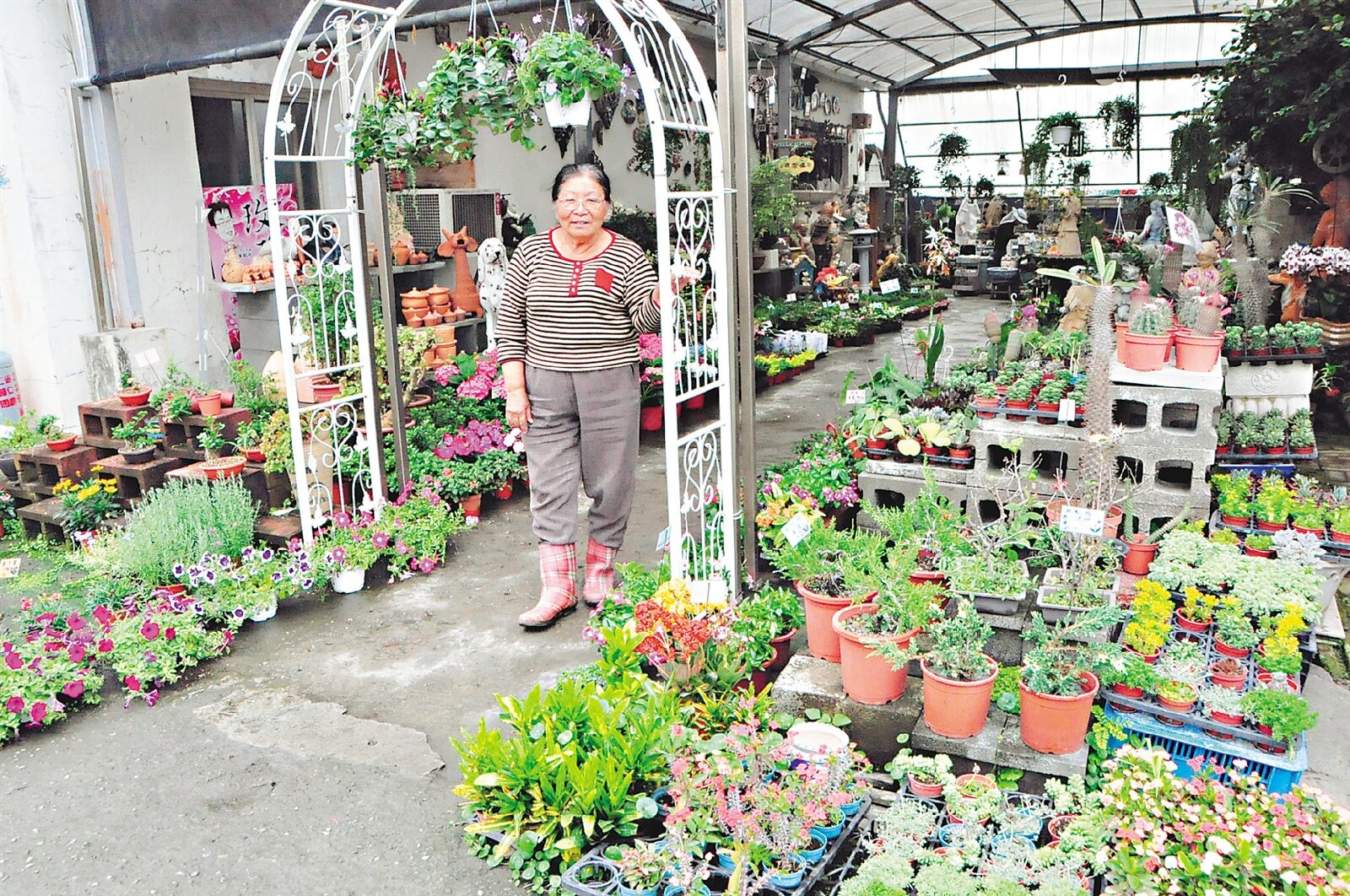黃榕子種花草40多年,是七甲花卉區裡最年長的園藝達人,跟植物有關的知識都難不倒她。(記者綦守鈺/攝影)