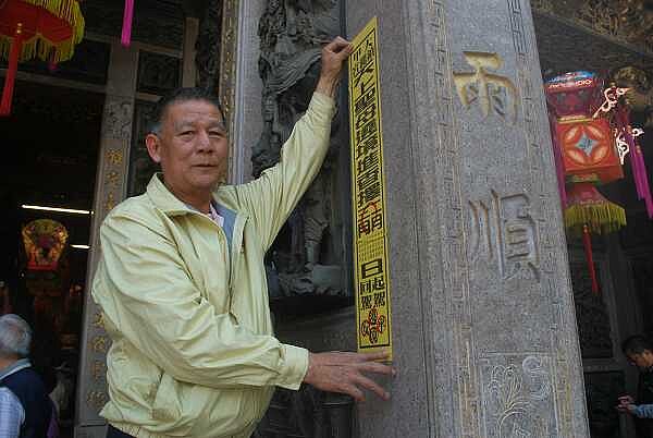 大甲媽祖定於農曆二月二十五日子時展開九天八夜繞境進香活動,鎮瀾宮常務監事陳水田昨晨在廟大門樑柱上張貼大甲媽祖起駕日期香條,並在沿途駐駕的寺廟張貼,告知媽祖到達時日。(記者陳榮昌攝)