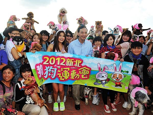 新北市政府6日在蘆洲微風運河旁狗狗運動場舉辦「2012新北狗狗運動會」,市長朱立倫、議員李倩萍、李坤城、黃桂蘭、陳明義以及蘆洲區長黃麗足、水利局長張延光等人一起切開76吋的狗腳印大餅,揭開今天活動的序幕,這些狗腳印大餅也在稍後分送給現場的所有狗兒們享用。