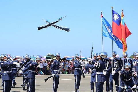 精彩的空軍樂儀隊表演高難度的拋槍動作。〔圖/主辦單位提供〕