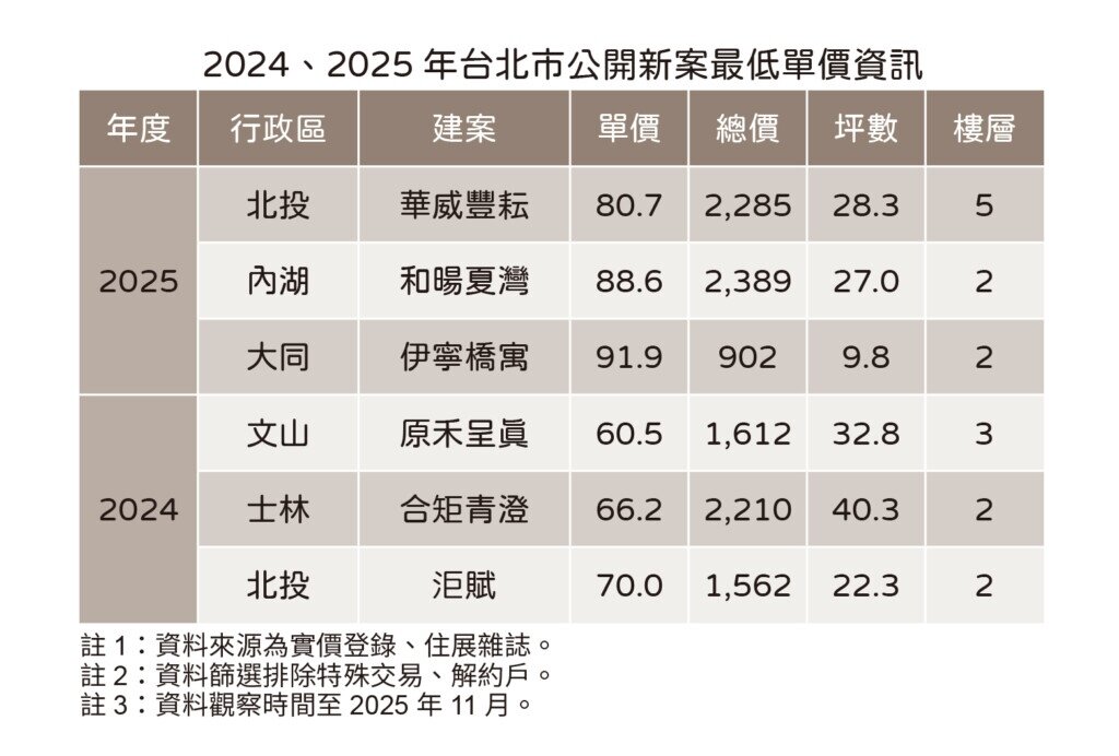 住展雜誌彙整高房價台北市在2024、2025年公開之住宅類預售新案,截至11月實價揭露的最低單價三案資訊,2024年是文山區政大山區的「原禾呈真」、士林區社子地區的「合矩青澄」,與北投區復興崗一帶的「洰賦」,單價各是60.5萬元、66.2萬元、70萬元。今年則為北投區復興崗區域的「華威豐耘」、內湖區四期重劃區的「和暘夏灣」,和大同區延三夜市地帶的「伊寧橋寓」,每坪交易80.7萬元、88.6萬元,以及91.9萬元。
