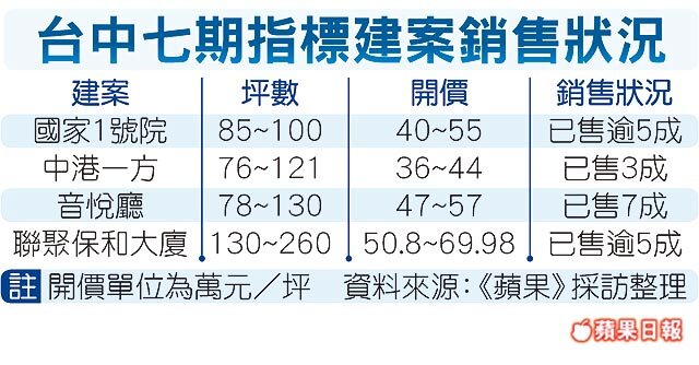 受前年實施奢侈稅及去年實價登錄影響,台中豪宅市場買氣交易冷清,但去年底七期重劃區因「音悅廳」、「聯聚保和大廈」等指標案公開後銷售佳,一併帶動七期買氣,有建商透露,「賣太快了,應會調高售價」。