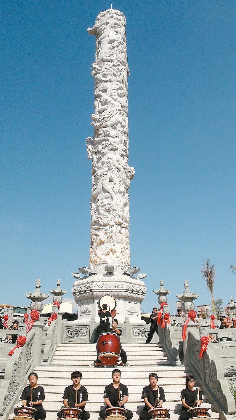 新竹市天公壇高達25.16公尺的九龍石柱昨天熱鬧落成。