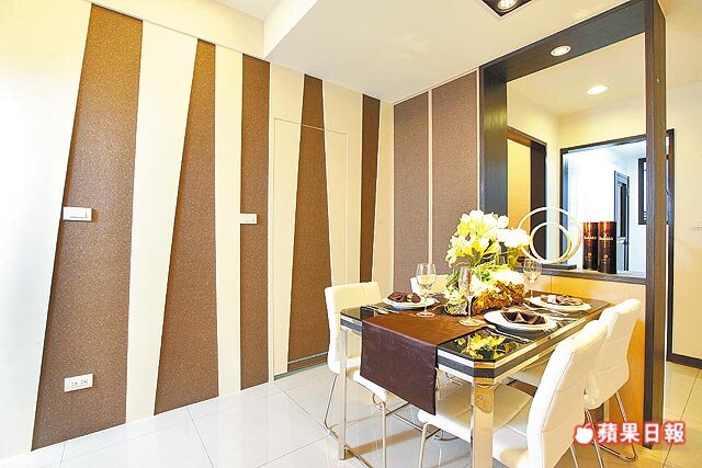 餐廳與衛浴相鄰,將衛浴開門採隱藏式設計,區隔空間機能,餐廳牆面設計凹凸造型,以暖色系色塊交錯使用,增加層次感。餐廳與廚房之間設計屏風櫃,林美珠特別選用深色系的木紋貼皮,凸顯獨立的用餐空間。