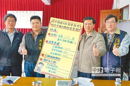 銜接台中、彰化的跨溪大橋興建有譜,立委顏寬恒(左二)、市議員林汝洲(右二)昨豎起大拇指說讚。(記者林欣儀/攝影)