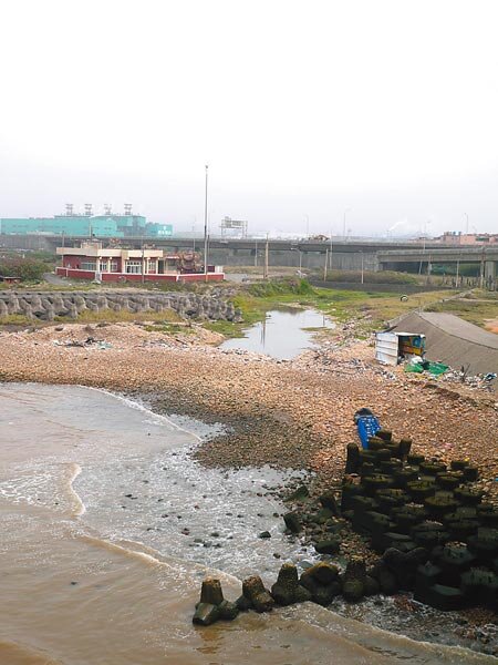 蘆竹鄉海湖村南崁舊溪出海口堵塞,溪水流不出去在出海口前形成池塘,每逢大潮就會溢入農田。(圖/蔡依珍攝)