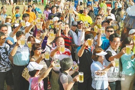 「乎乾啦!」火車匡噹匡噹聲搭配玻璃杯碰撞聲,1200多人12日下午在大樹舊鐵橋溼地公園,暢飲玉荷包啤酒,度過炎炎酷暑,同時歡慶舊鐵橋通車100年生日,有民眾特地從嘉義南下,直呼他們是為酒瘋狂,很值得。