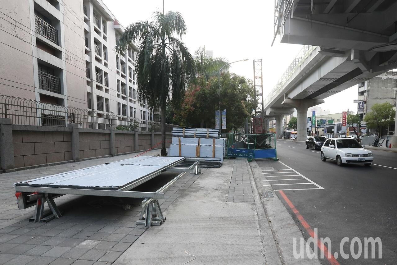 台中市文心路平完工,人行道仍像工地現場,引發疑慮。(聯合報記者黃仲裕/攝影)
