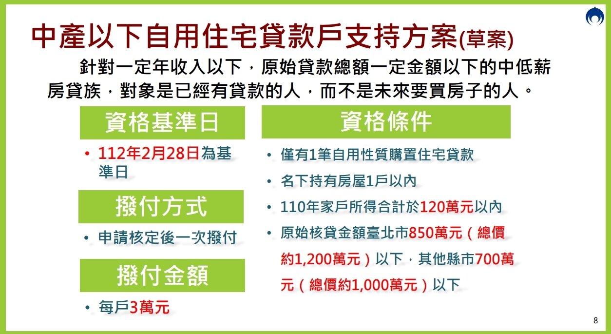行政院通過「中產以下自用住宅貸款戶支持方案」草案,設立雙門檻排富,針對僅有1筆自用住宅貸款、家戶所得120萬元以下,且原始核貸金額台北市850萬元以下者,其他縣市700萬元以下,以112年2月28日為基準日,申請核定後一次撥付。