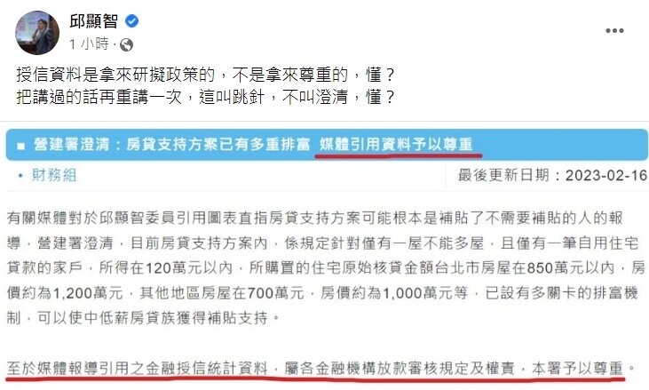 但邱顯智仍不買單,強調授信資料是拿來研擬政策的,不是拿來尊重,而營建署只是把講過的話再重講一次,叫做跳針,而不叫澄清,根本沒回答到問題本身,砲轟房貸補貼政策「邏輯死亡」。