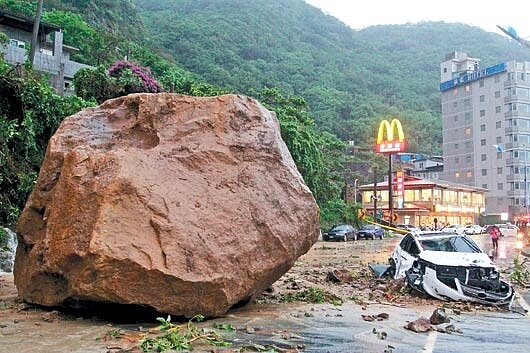 基隆市北寧路碧砂漁港旁山坡因連日豪雨而崩塌,發生巨石掉落砸車的驚險事故,事發山坡上現在還有一顆姐妹石懸矗在山頭。昨日受託前往現地勘察的陸軍53工兵群官員認為,連日豪雨使得北寧路整片山坡飽含水份,若冒險對巨石以軍用炸藥採行爆破,難以拿捏震波對山坡的影響,爆破須審慎評估。
