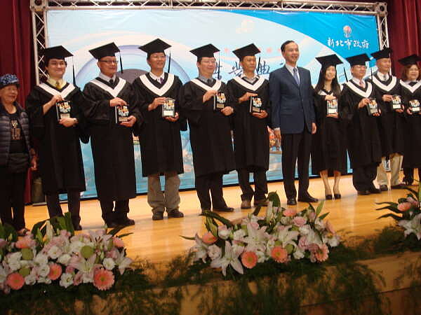 圖說:身兼校長的市長朱立倫出席第二屆企業產經大學結業典禮,親自頒給10所配合學校感謝狀,及熱心服務獎與結業奨座。(記者黃村杉攝)