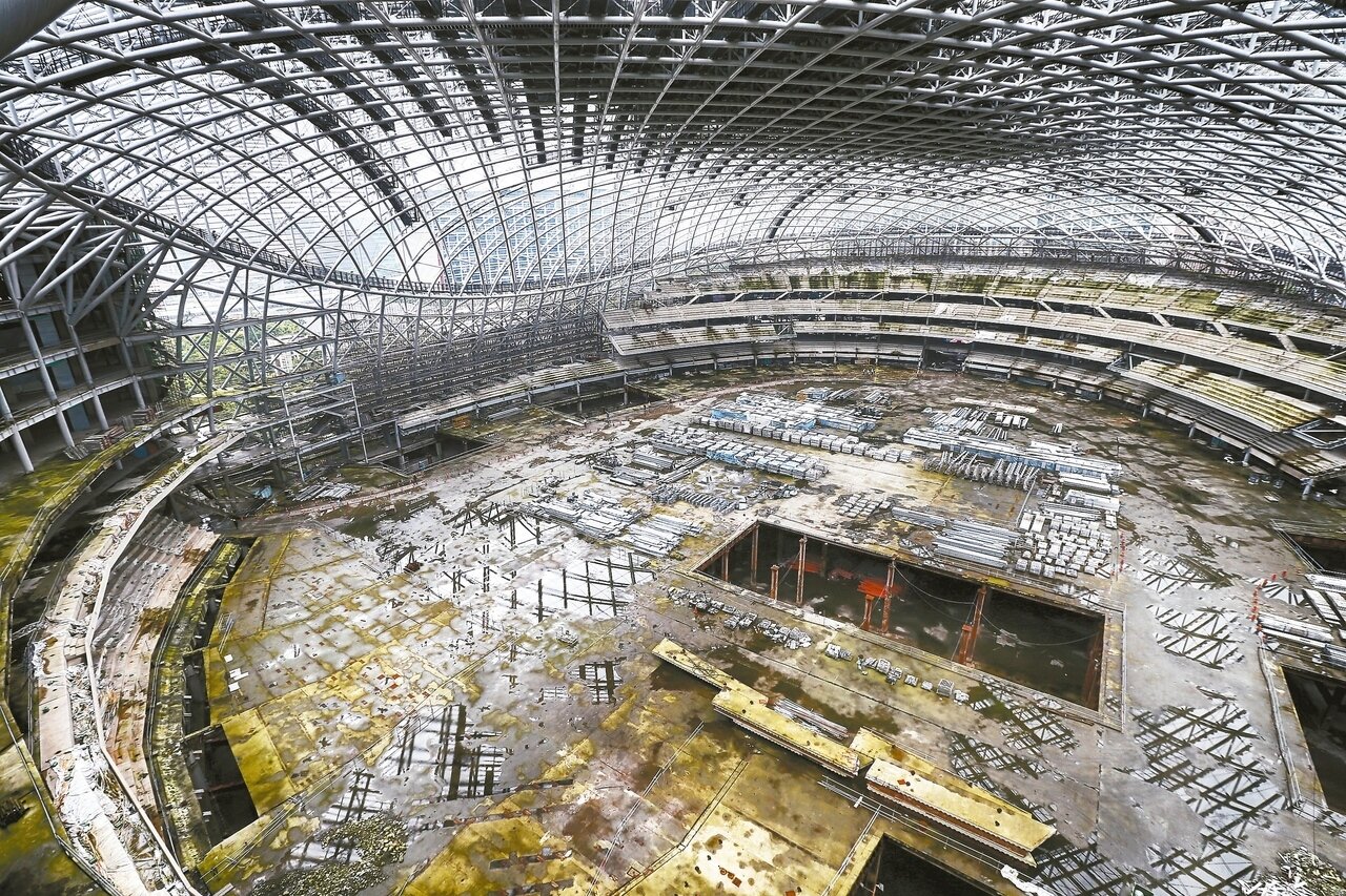 大巨蛋去年五月停工至今快屆滿一年,北市議會工務委員會昨進入會勘,首度揭開大巨蛋停工後的面貌。但眼前的景象教議員個個搖頭歎息,剛下過雨的工地一片泥濘,隨處可見蛋體鋼梁生鏽,看台區已長滿青苔,地下層更是積滿了水,是一處無人聞問的爛尾樓。