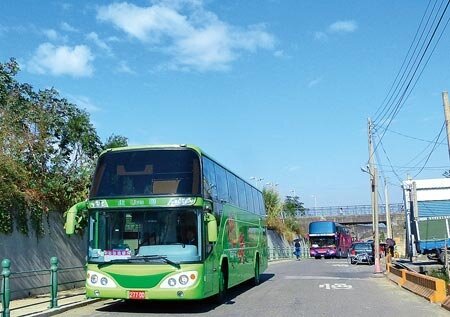 板頭村遊園車無法上路,遊覽車不得已載客擠鄉道。(記者王瑄琪/攝影)
