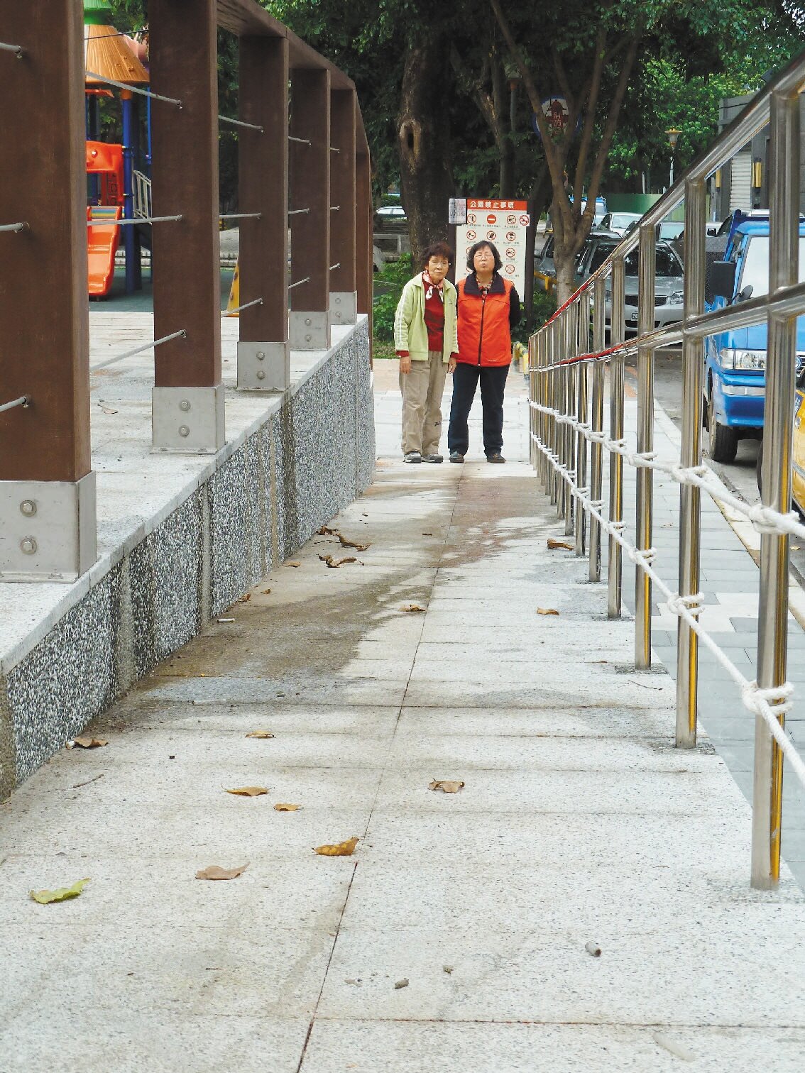 當地誠安里里長李有福表示,斜坡道與涼亭入口高低落差大,公園的人行地磚也鋪得鬆鬆垮垮,翹起的路面還常讓居民不小心絆倒。