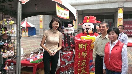 南投市長許淑華、張秀枝主席在年貨大街上祝福大家大發利市。(記者冀敏攝)