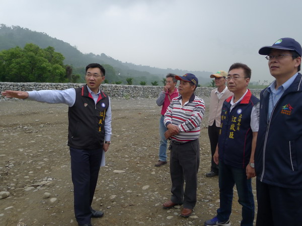 立委江啟臣(左一)勘查新社區大甲溪畔陳年垃圾的清運結果,欣慰徹底解決垃圾污染環境問題。(記者黃玉鼎攝)