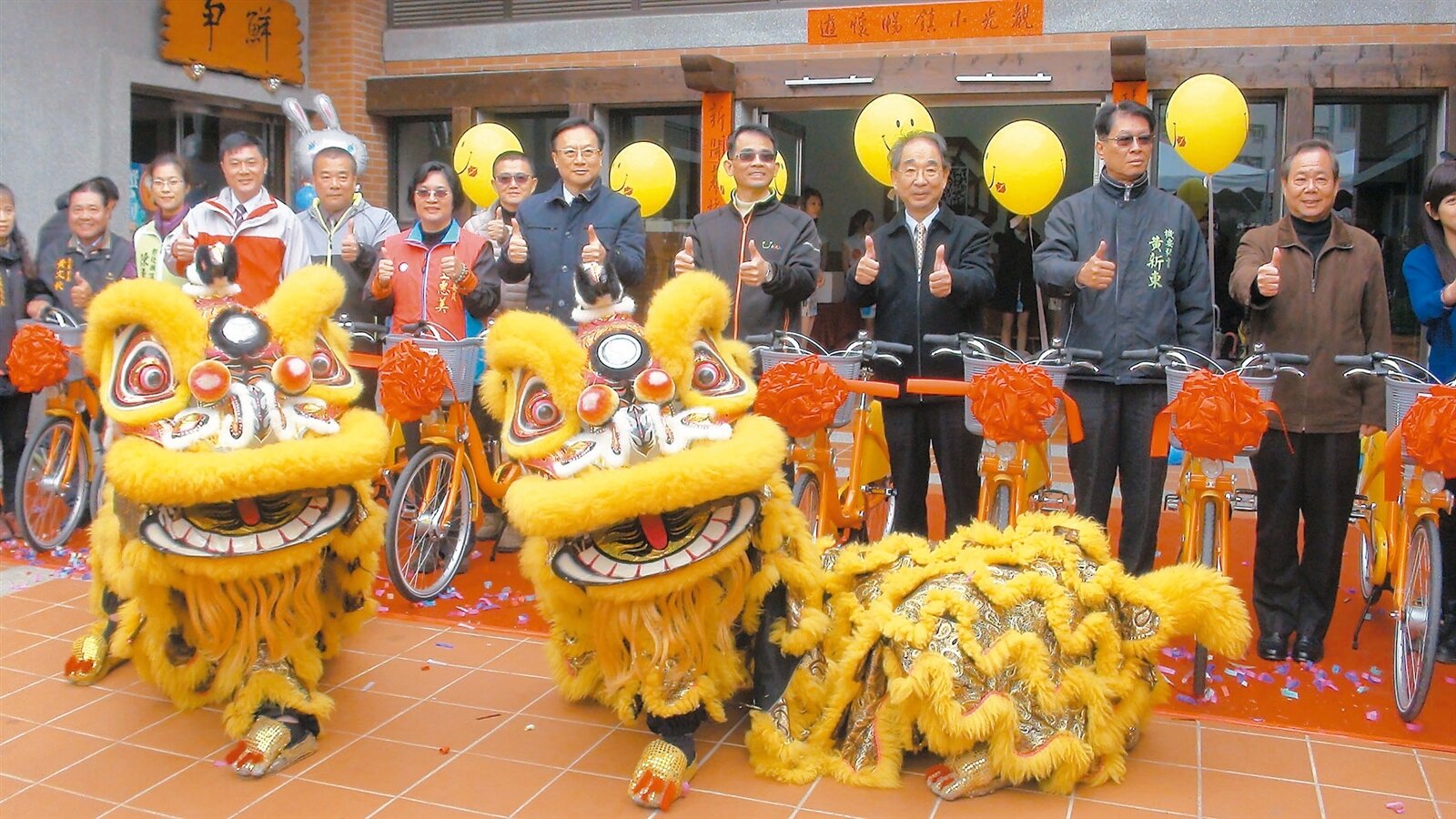 鹿港YouBike昨天啟用,縣長卓伯源(右四)帶領大家騎單車逛鹿港。(記者郭宣彣/攝影)