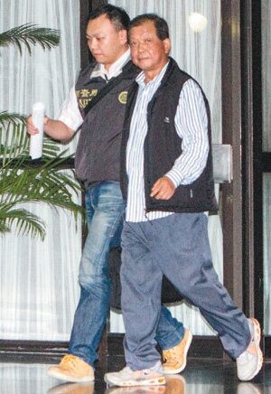 劉政池(右)被控竊佔國土,昨天深夜 十一點半由調查官帶往士林地檢署接受檢 察官偵訊。(記者鄭清元/攝影)