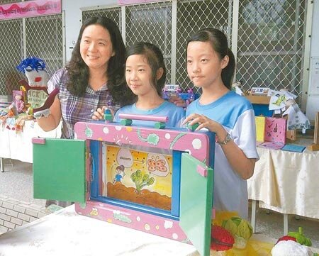 創作家薛惠玲(左)教聯美國小學童把舊課桌椅DIY,變成創意故事箱。(記者許素惠/攝影)