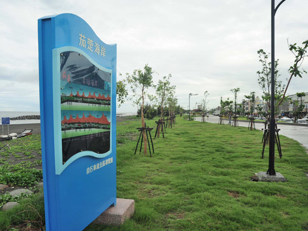 高雄市茄萣海岸復育暨景觀二標工程完工,呈現茄萣截然不同的海堤風光,假日人潮湧現,市長陳菊表示,茄萣海岸線綿長優美,為提升安全美觀,市府將加強護灘、培厚海堤,打造安全的戲水場域,也將選擇適合樹種全面植栽,讓迷人海岸更易親近。