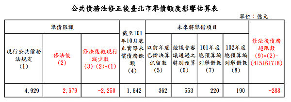 圖說:公共債務法修正後台北市舉債額度影響(製表/台北市政府)