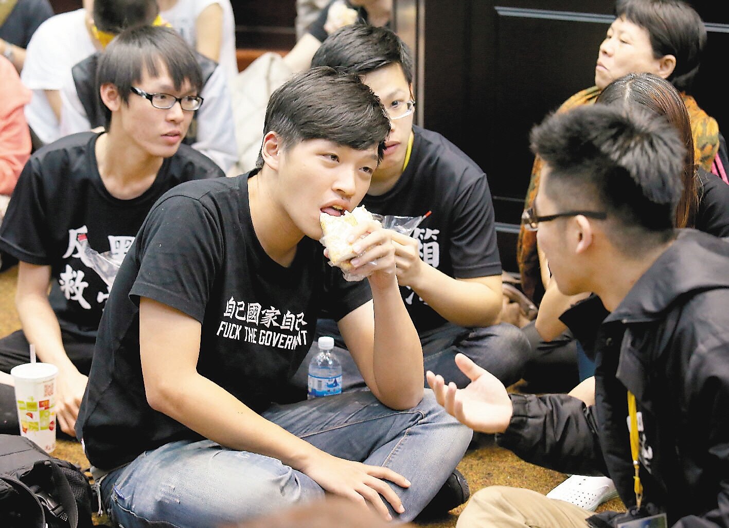 今日上午十時,學運領袖陳為廷再度進入議場,和議場內近百名學生圍坐在議場前方召開「第一次也是最後一次」的早餐會報,在幹部主持下,大家一邊吃三明治和漢堡一邊發表連日學運感言。