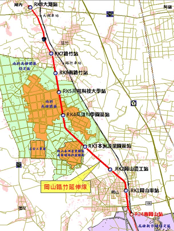 高雄市政府規劃的高捷岡山路竹延伸線,貫穿橋頭、岡山、路竹等地區的科技產業,路線起於捷運紅線R24站,行經臺鐵岡山站、岡山農工、高雄科學園區、高苑科技大學、路竹市區,止於湖內區之臺鐵大湖車站附近(臺1線與臺28線交叉口),全長13.22公里,設置8座車站,將服務大岡山、路竹、湖內地區35萬民眾,使高雄都會區北向軸線延伸。