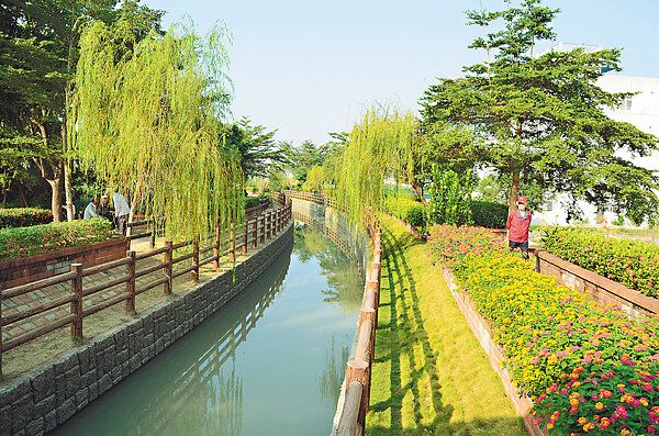 嘉南大圳南幹支線流經新化區體育公園段,經改建為「水路公園」,兩旁步道花木扶疏,成了民眾最佳的休閒散步去處。 (圖/吳淑玲攝)