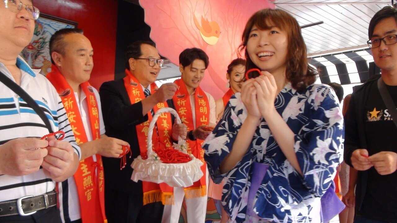 看好宗教觀光潛力,高雄市觀光局長潘恒旭打出神明牌,今天上午應邀出席高雄姜太公道場啟動典禮、與藝人黃文星、謝金晶、網紅直播點姻緣燈,分送象徵愛情長長久久的月老紅線給上百位粉絲,以宗教元素推動愛情產業鏈及神算產業,吸引不少民眾,連在高雄工作的日本女性也穿和服到場,希望能求得好姻緣。
