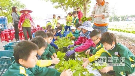 永靖國小150多名小朋友為了實現自足與分享收穫,去年11月20日在成美文化園農地種下各種蔬菜的種苗,1個半月他們親手拔草、灌溉,昨天歡喜採收並到市場叫賣,所得將作為學校教學基金,也為自己換來營養午餐。