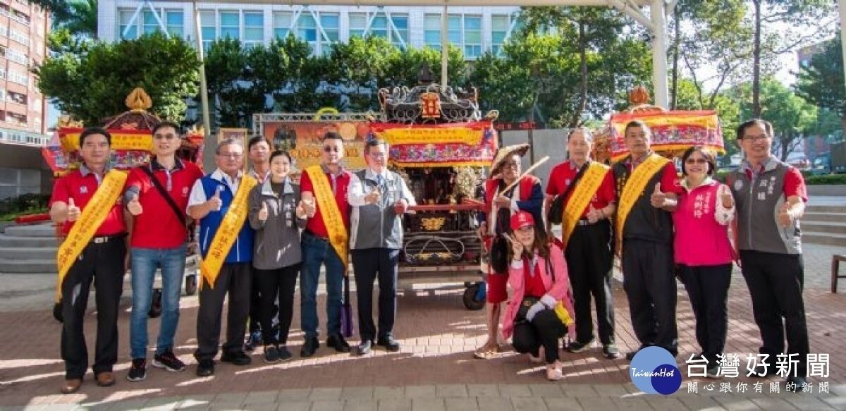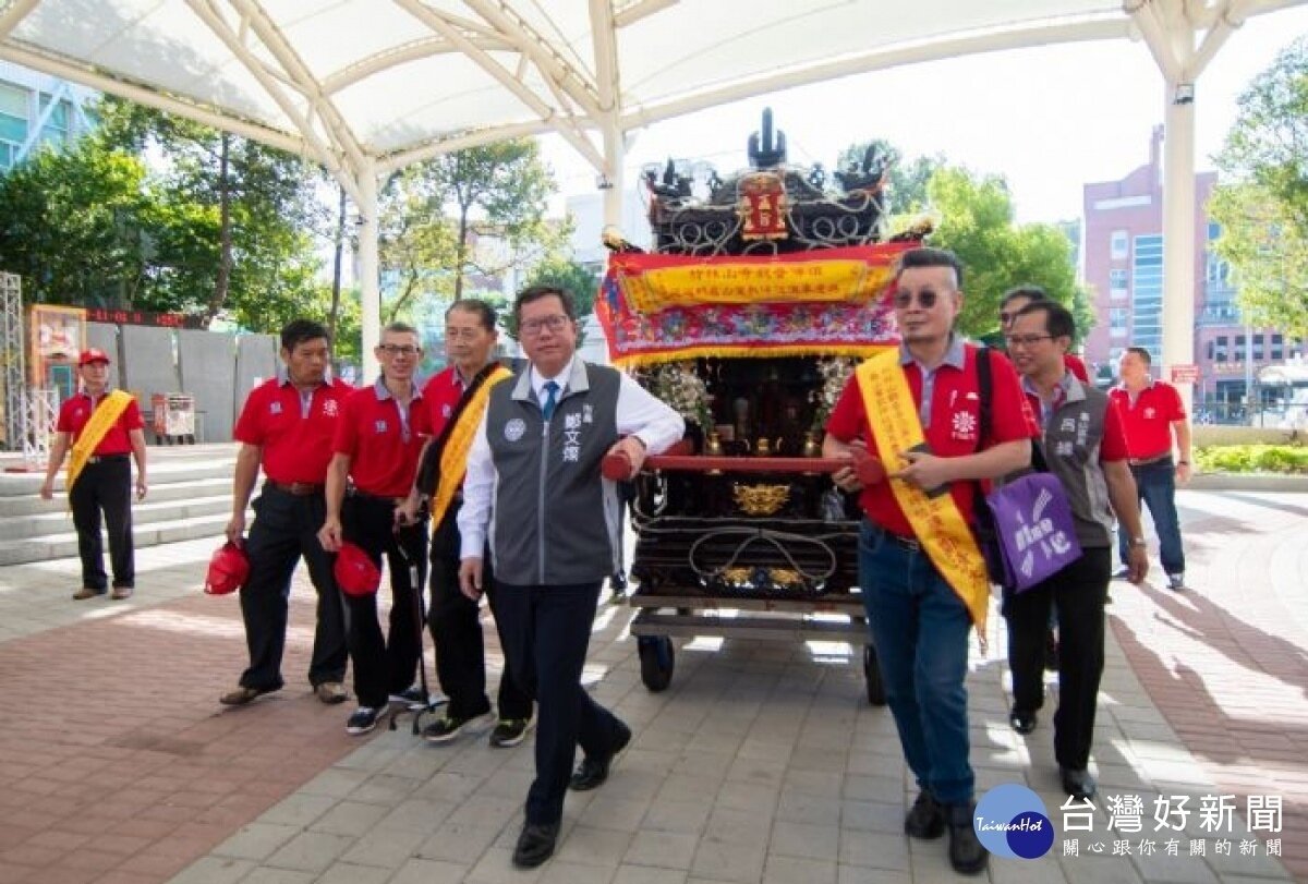 桃園市長鄭文燦1日上午前往龜山區公所前天幕廣場,出席「竹林山觀音寺民國109年庚子年觀音佛祖巡迴媽龜山、鶯歌坪位 迎過頭媽(二媽)慶典遶境、踩街活動」。