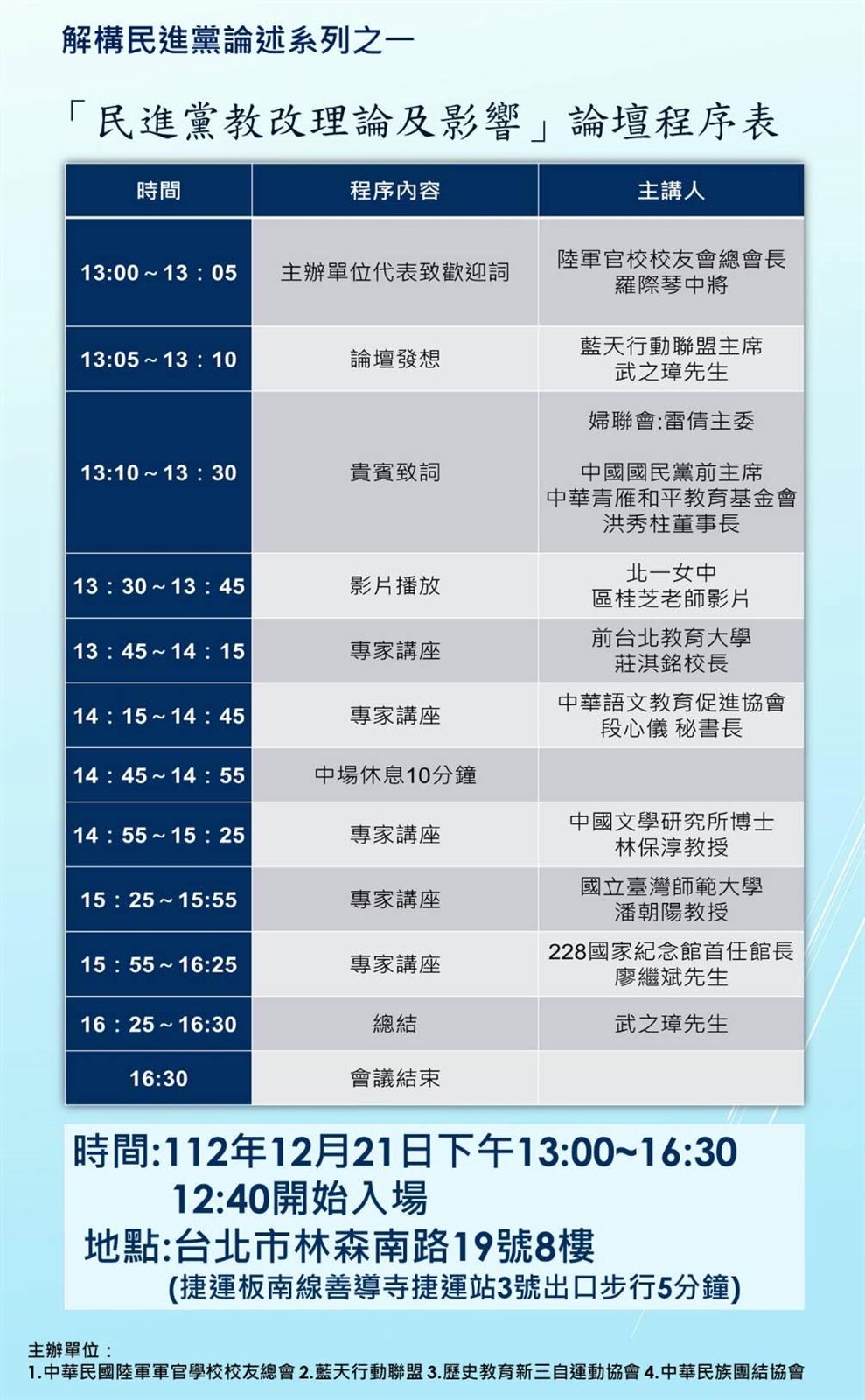 另外,第一場解構民進黨論述系列研討會將於週四(12/21)下午登場,會上將邀集6位主講人,包括藍天行動聯盟主席武之璋、中華語文教育策進協會秘書長段心儀、國立師範大學教授潘朝陽、北一女中老師區桂芝等,針對民進黨教改理論進行討論。
