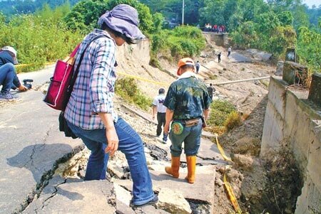 這條山路開在稜線上,沿途優美有小黃山之名,平常除了村民往來、採收竹筍與蓮霧,登山客踏青也都愛,但上月底被康芮颱風的雨勢掏空路基,路面陷落山谷中斷100餘公尺。由於繞路得花10幾公里,路基坍陷後2村民循著殘餘路面勉強通行,但農產無法外運,林內公所向3單位申請修復,但從中央到縣府都說非他們管轄。