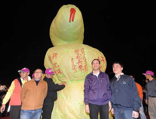市長朱立倫及台北市長郝龍斌出席,共同施放12呎的大型蛇形天燈「青小龍」。(記者黃村杉攝)